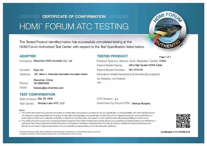 DNS于2020年9月29日獲得了HDMI協會頒發的HDMI 2.1認證證書,成為首批獲得UHS線纜認證制造商之一。